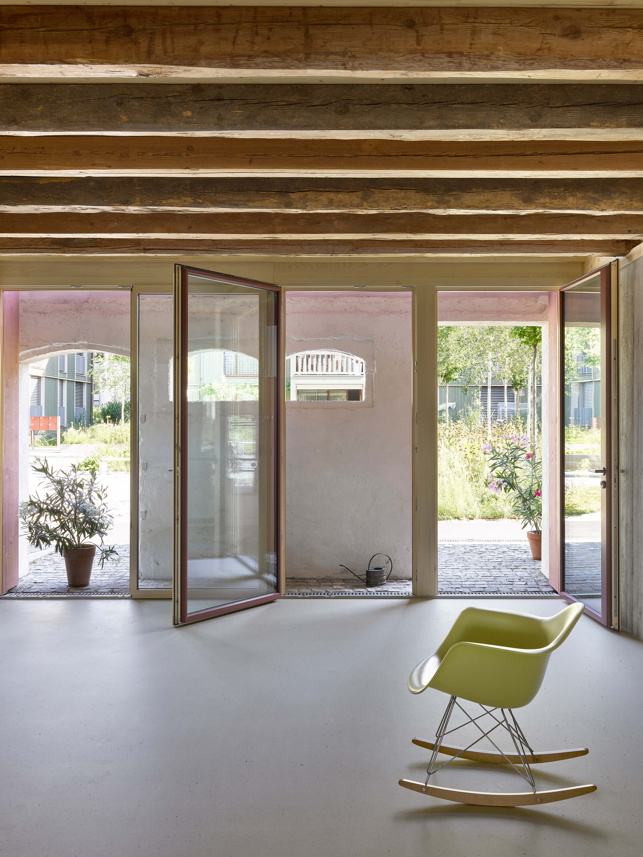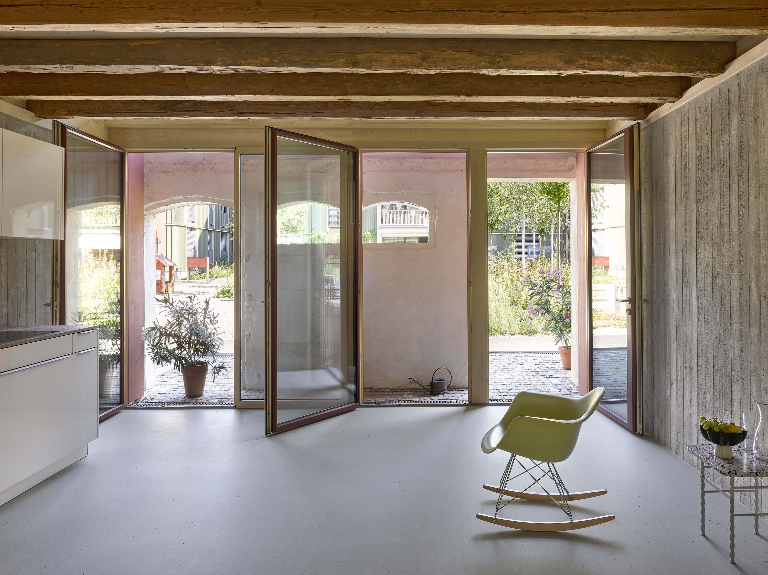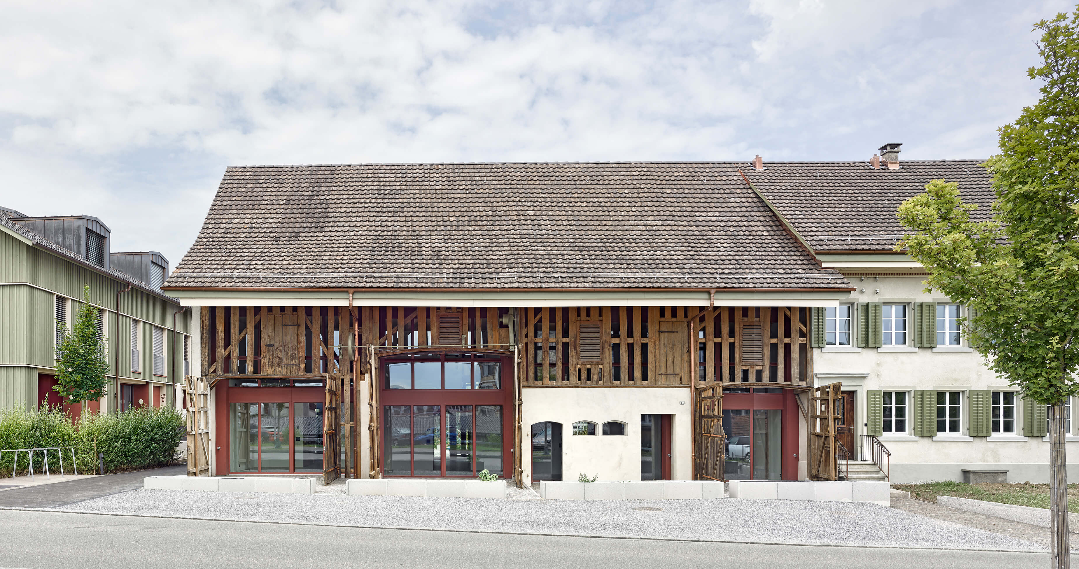 Wer sich hinter das alte Haus wagt, der erkennt dessen Rolle: Es ist der Keim, aus dem eine ganze Wohnsiedlung entstanden ist. Der bäuerliche Werkplatz stand Referenz für den Wohnhof mit Spielplatz, die vernakuläre Bretterschalung für die Deckleistenschalung, die Balkonbrüstung und die Betontextur der Neubauten, das Rot des Konsolenfrieses für die Füllungen, das Grün der Fensterläden für die Fassade und das Beige des Verputzes für die Laibungen.