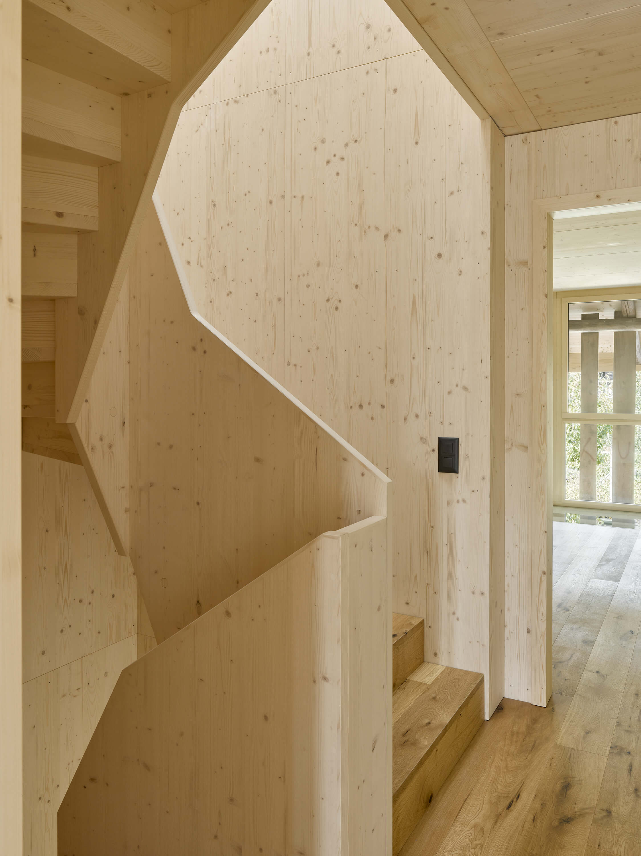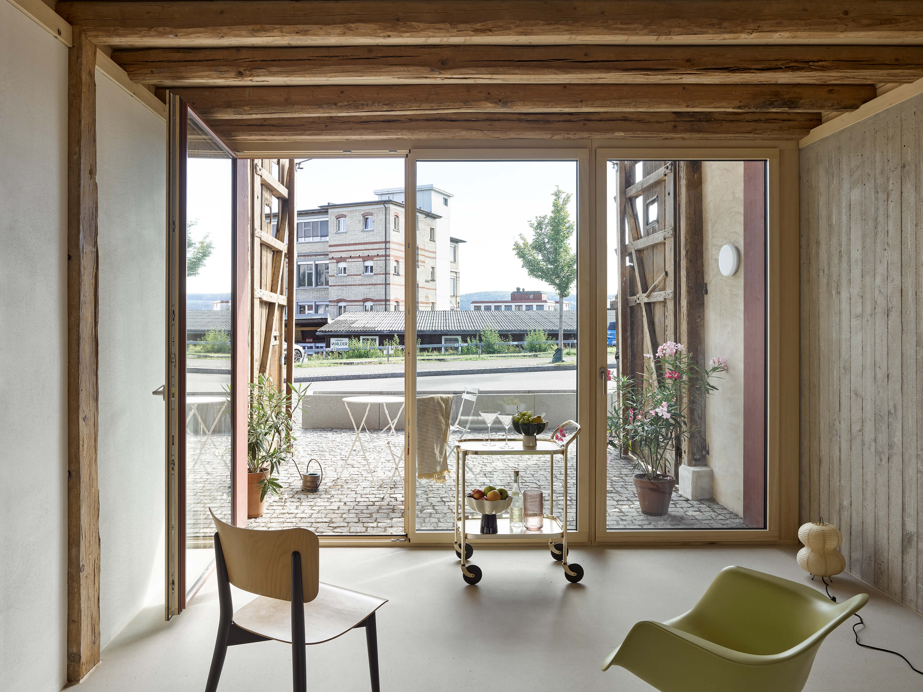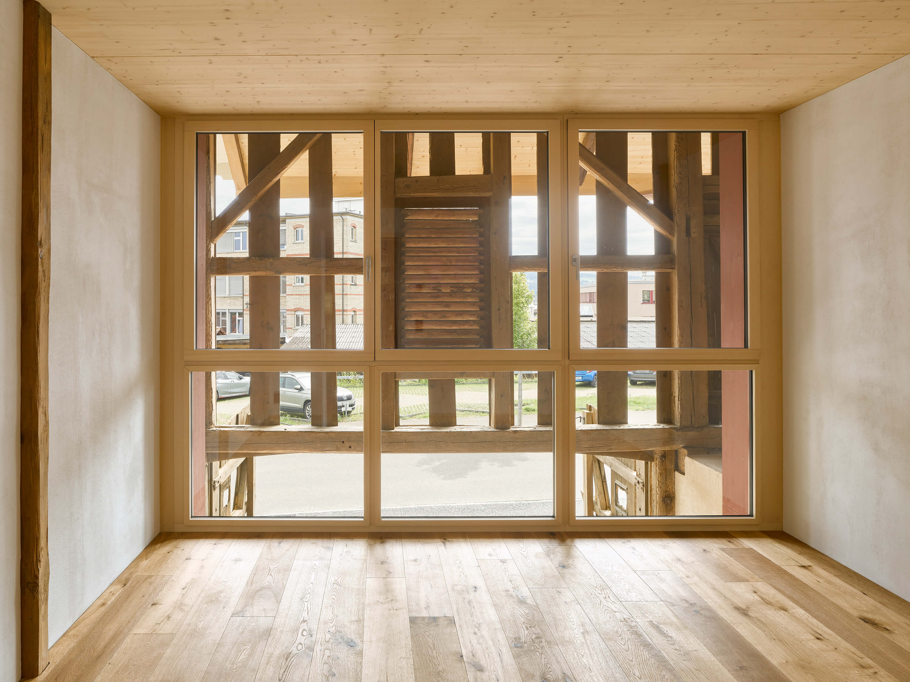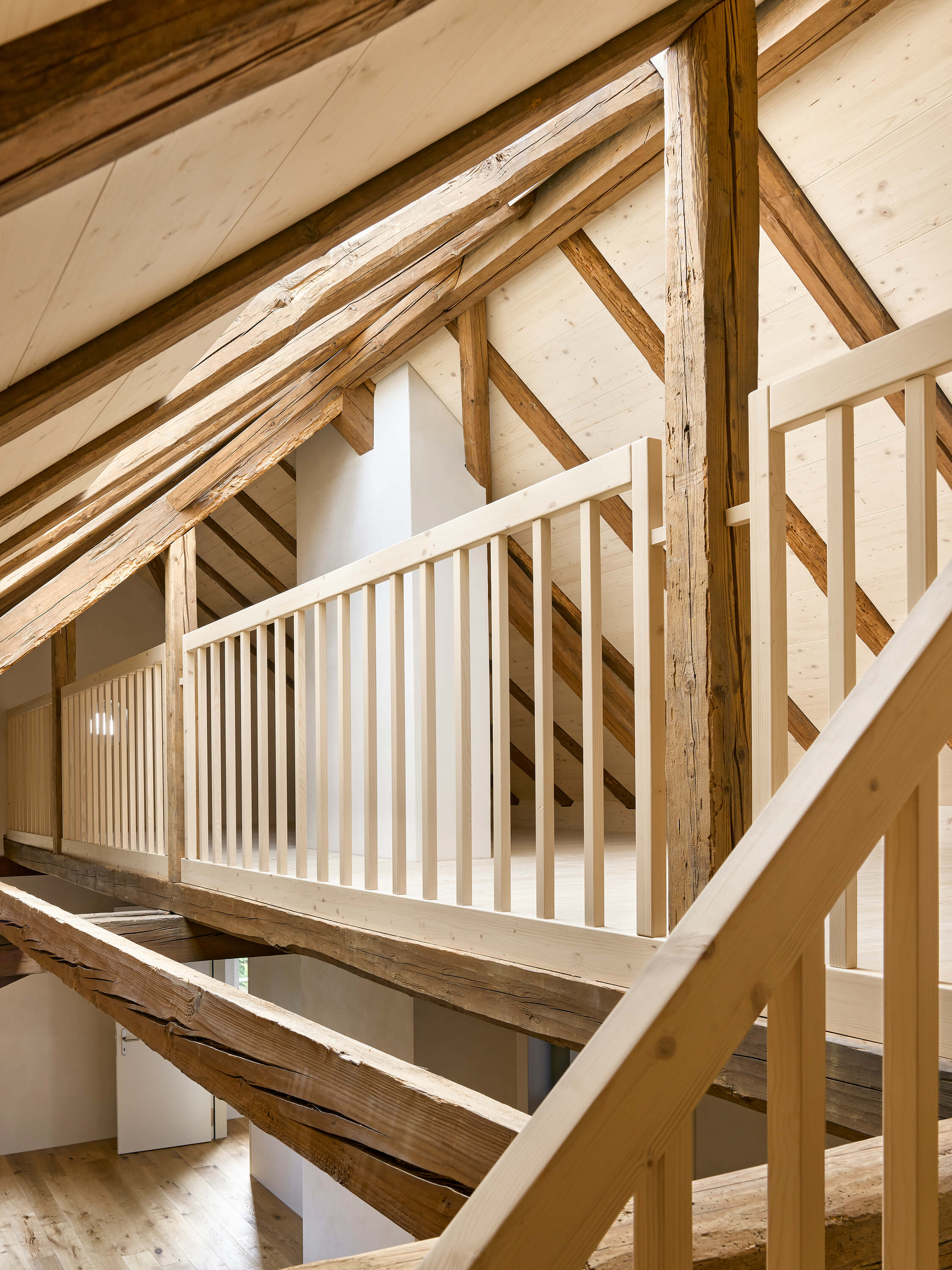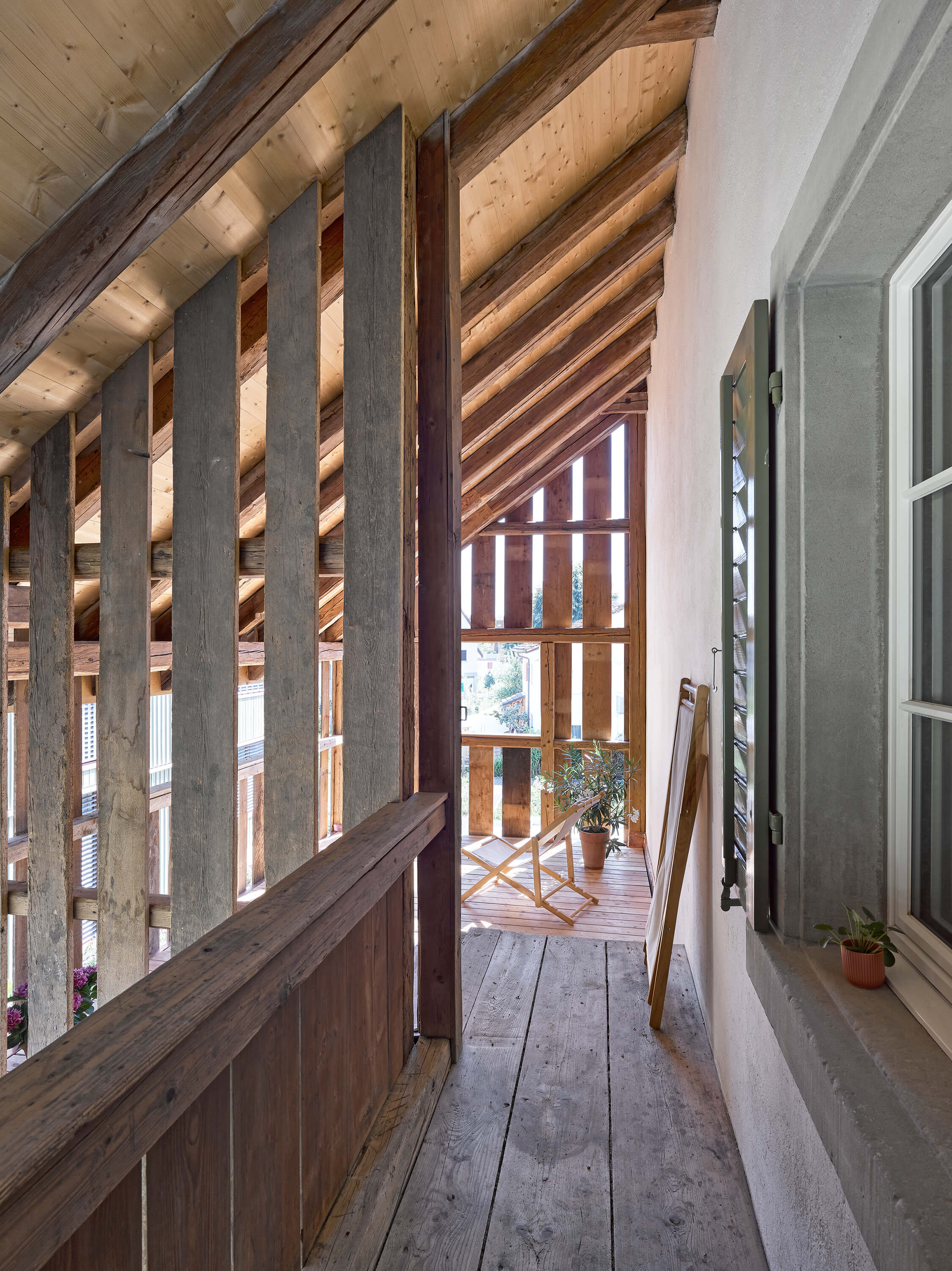 Unter dem Dach des Ökonomiegebäudes finden vier neue Wohneinheiten Platz: gestapelt über drei Geschosse entsteht je ein Haus pro Achse. Gebaut wird Haus in Haus: die ehemalige Fassade wird zur Hülle, der Raum dazwischen zum Filter für Licht und zum geschützten Aussenraum, der durch das weit auskragende Dach und die geöffneten Tore private Geborgenheit verspricht. Die Wohnräume im Innern zeigen den Dialog zwischen dem ursprünglichen Holztragwerk und der neuen Raumstruktur offen zur Schau.
